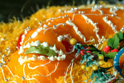 Ingredientes: Para os fios de ovos: • 60 gemas • 5 claras • 1 kg de açúcar Para os ovos moles: • 175 grs de açúcar • 12 gemas • 1 clara Para a espécie: • 250 grs de amêndoas • Açúcar para caramelo • Glacê de açúcar branco